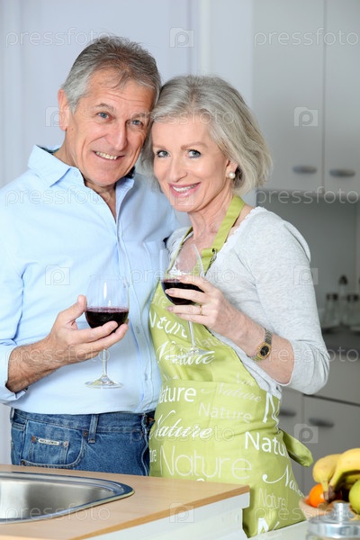 Пожилые супружеские пары, пить вино на кухне
