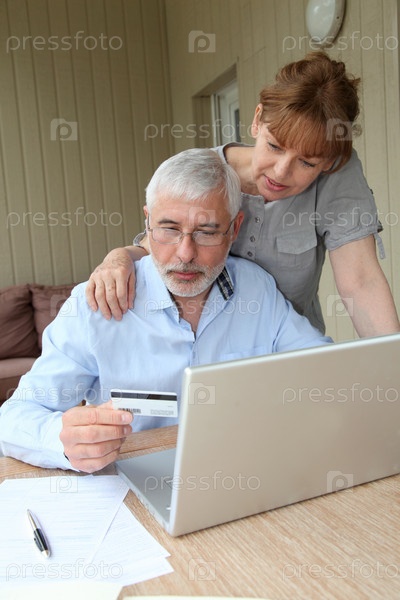 Пожилая супружеская пара делает покупки в Интернете