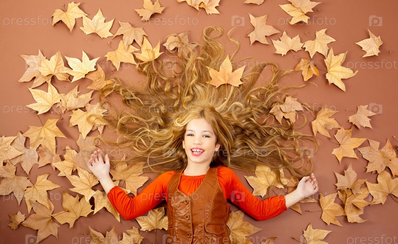 Рыжеволосая девушка лежит среди осенних листьев