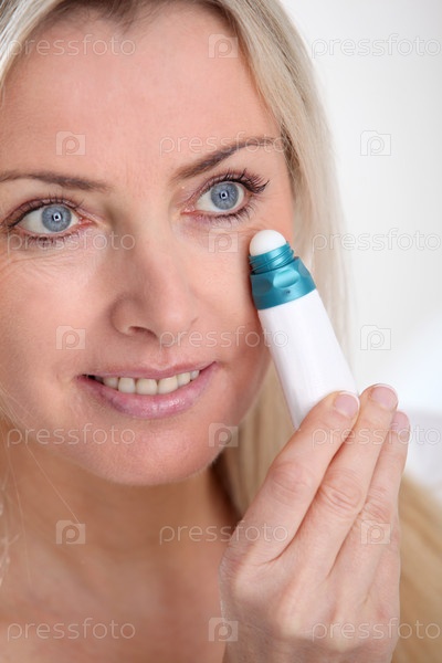 Блондинка применяет омолаживающую сывороткуна на коже вокруг глаз
