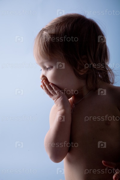 Портрет удивленной маленькой девочки на голубом фоне