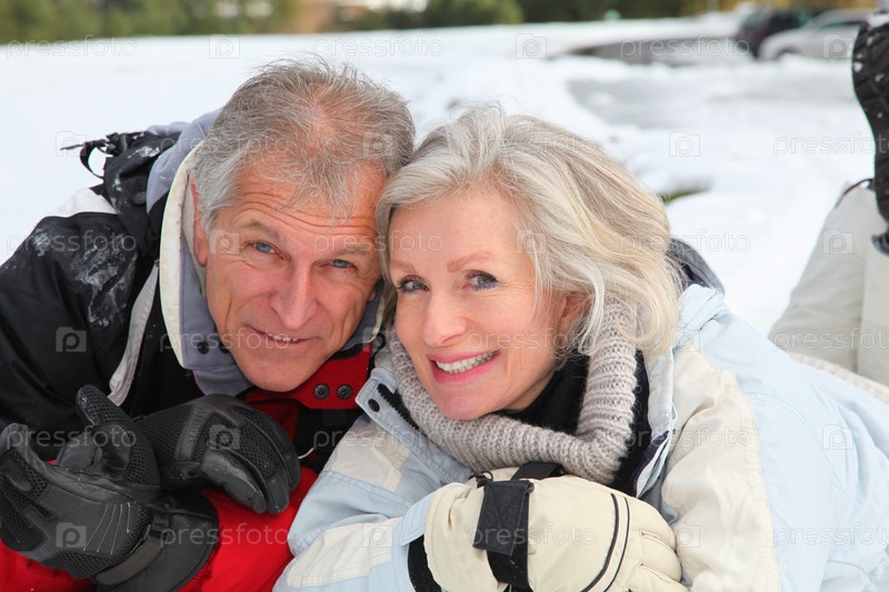 Пожилые супружеские пары, весело на горнолыжном курорте