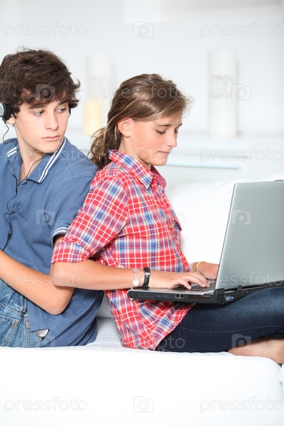 Подростки с музыкальный проигрыватель и компьютер у себя дома