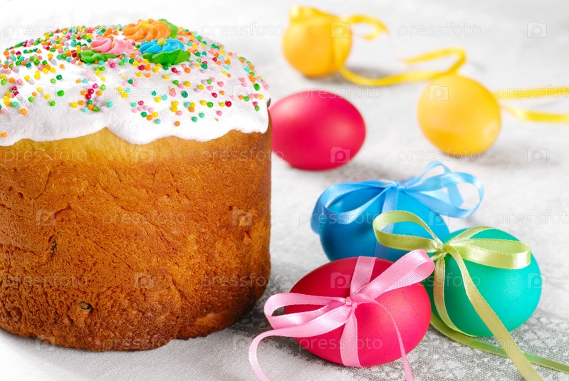 Пасхальный хлеб и крашеные яйца на ярком фоне