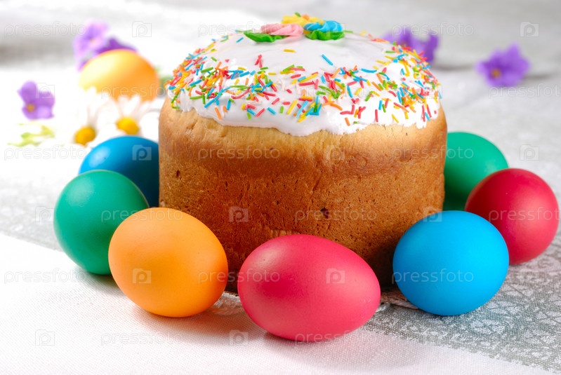 Пасхальные яйца и торт на ярком фоне