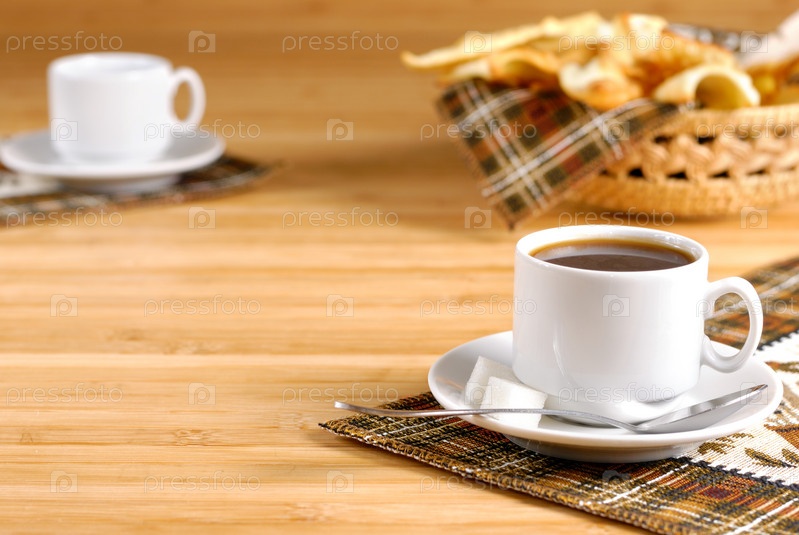 Две чашки кофе, корзина с куки на деревянный стол