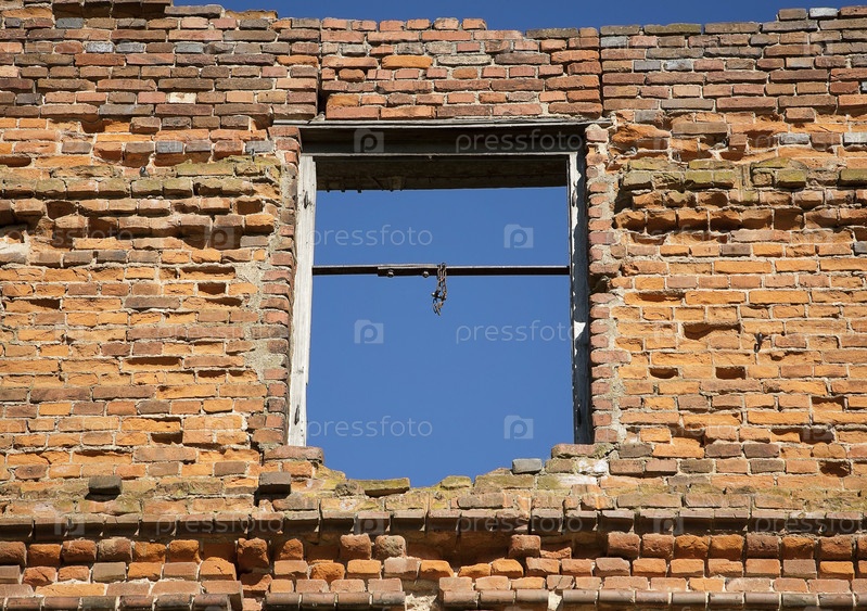 Кирпичная полуразрушенная стена с пустым окном на фоне голубого неба