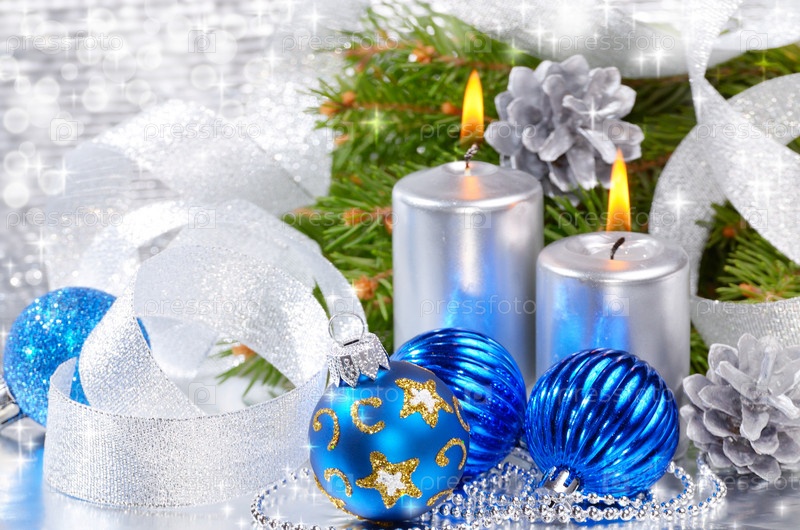Голубые елочные шары с серебряные свечи
