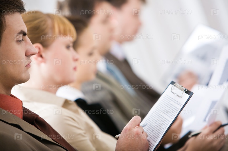 Профиль серьезного человека, делающего заметки на документе во время семинара