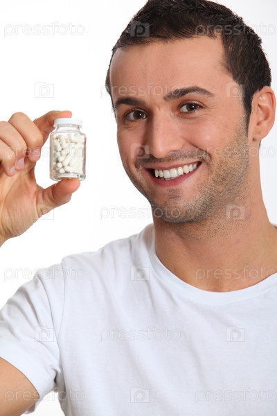 Улыбающийся человек, держащий бутылку таблетки