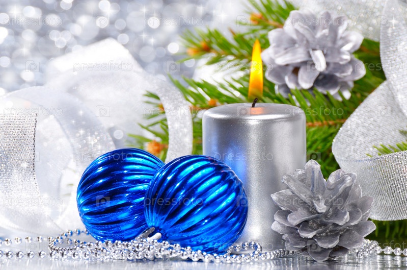 Голубые елочные шары с серебряные свечи на ярком фоне