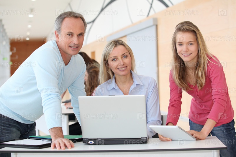 Учителя и девушка перед компьютером