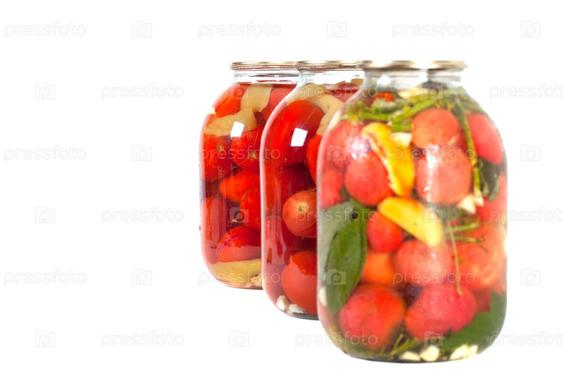 Маринованные красные помидоры в стеклянных банках, изолированы на белом фоне