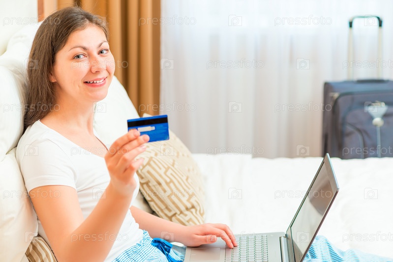Счастливая девушка готовится пойти в отпуск с помощью кредитной карты