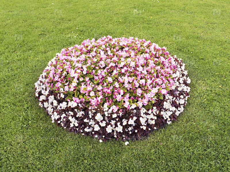 Клумба с различными цветами в центре газона