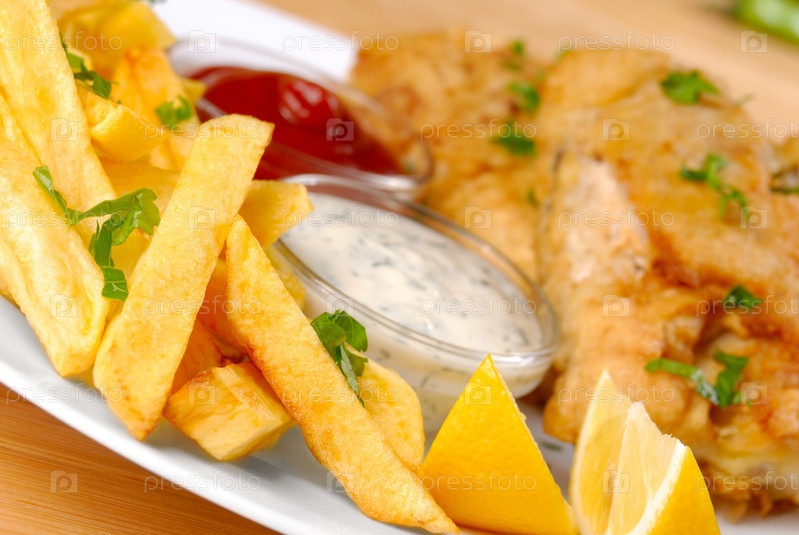Рыбой, чипсы, майонез, кетчуп и лимон