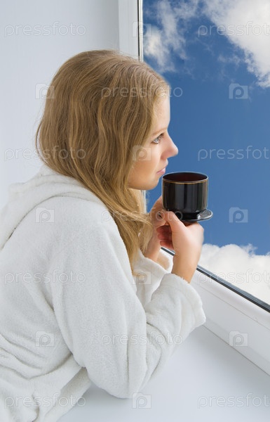 Симпатичная девушка с кружкой чая у окна