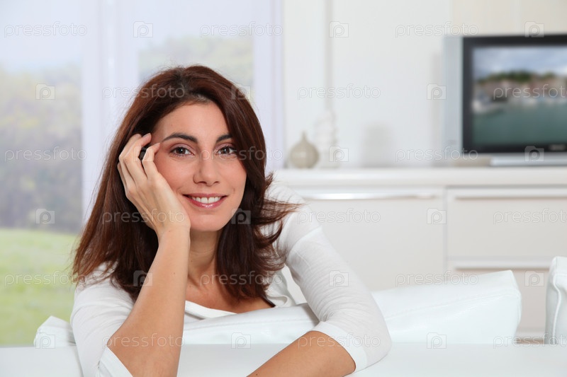 Портрет молодой женщины, сидя в диван смотреть телевизор