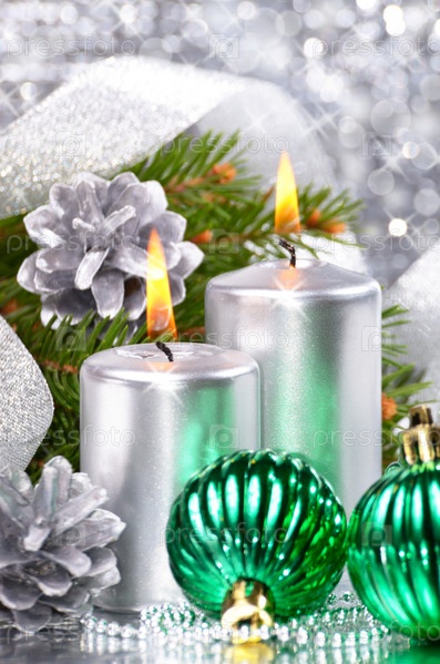 Рождественские шары с серебряные свечи на ярком фоне