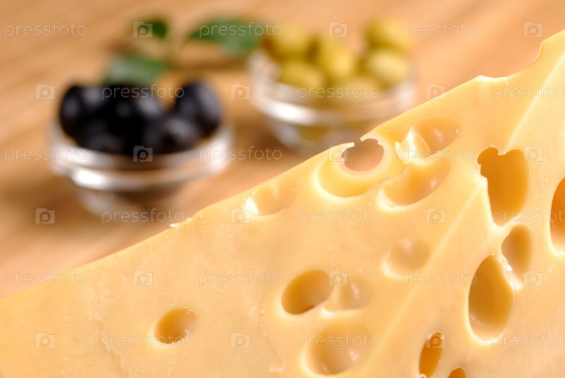 Сыр "Эменталлер" с оливками на разделочной доске