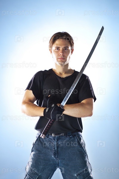 Сильный человек с самурайский меч. На мягких синем фоне