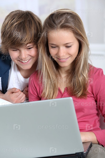 Брат и сестра, используя портативный компьютер у себя дома