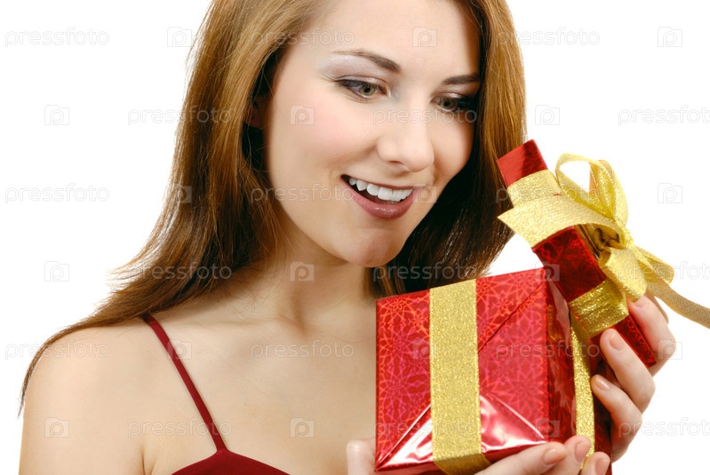 Счастливый девушка с подарочной коробке на белом фоне