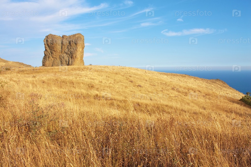 Одинокий рок среди сухой полевой травы, на фоне синего моря и голубого неба