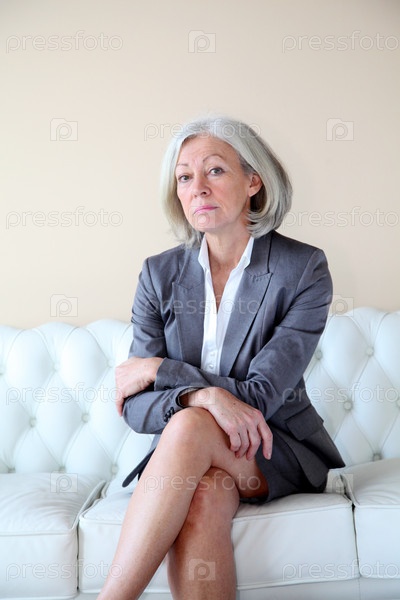 Старший женщина в сером костюме, сидя в Белый диван