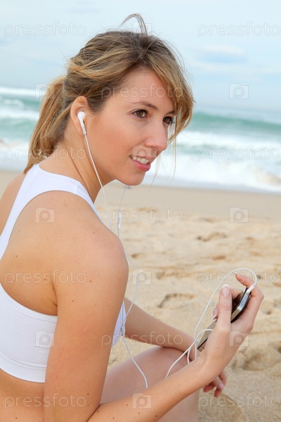 Портрет женщины, осуществляющие на пляже с наушниками на