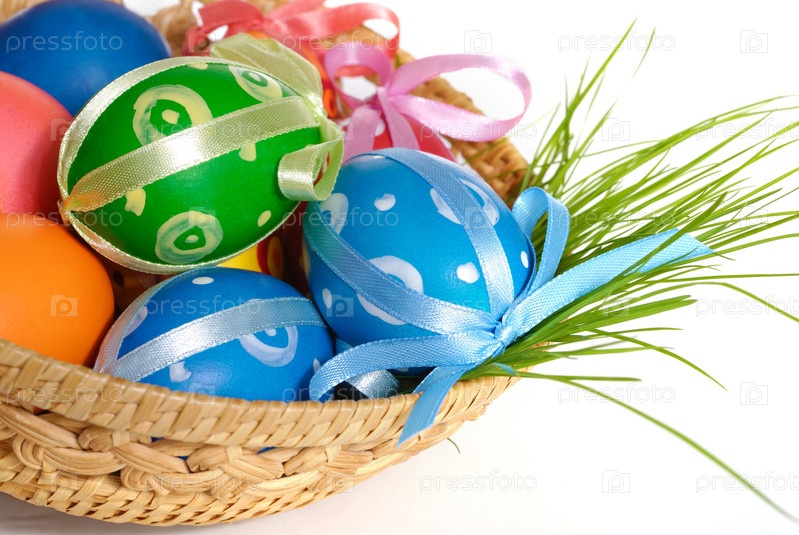 Пасхальные яйца в плетеную корзину, изолированные на белом фоне
