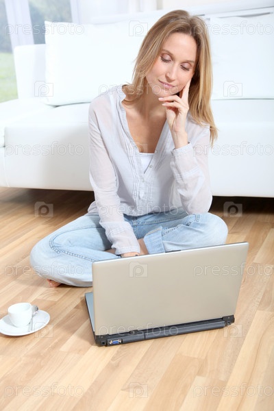 Красивая блондинка женщина, серфинг по Интернету на дому