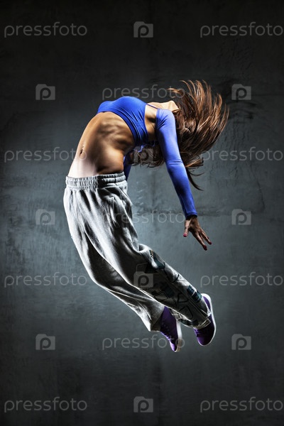 Молодая женщина танцовщица прыжки. На фоне стены