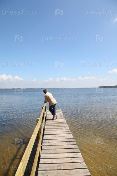 Человек на понтон на озере в летнее время