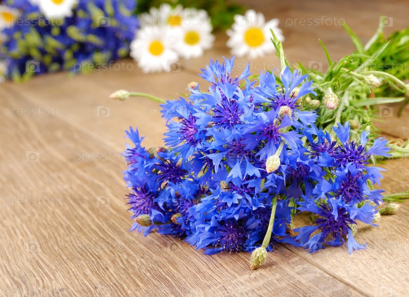 Свежие цветы васильки и ромашки на деревянных фоне
