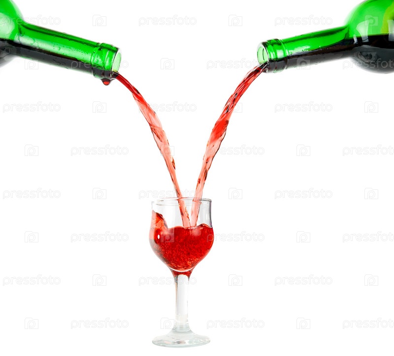 Вино наливается в бокал из двух бутылок