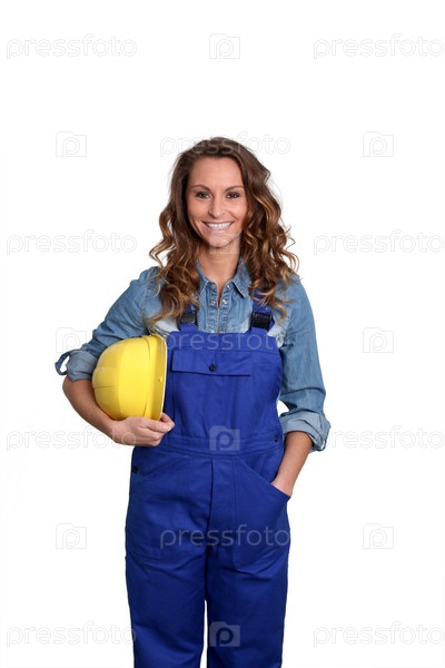 Женщина с желтым безопасности шлем стоя на белом фоне