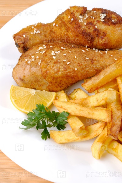 Жареные куриные ножки с лимоном и картофеля, служил на белом фоне