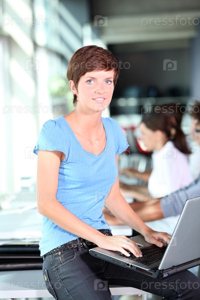 Молодая женщина, работающая на портативном компьютере