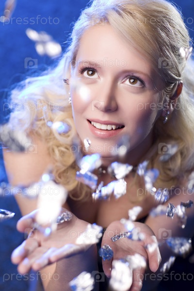 Молодая женщина романтический ловить падающие блестки
