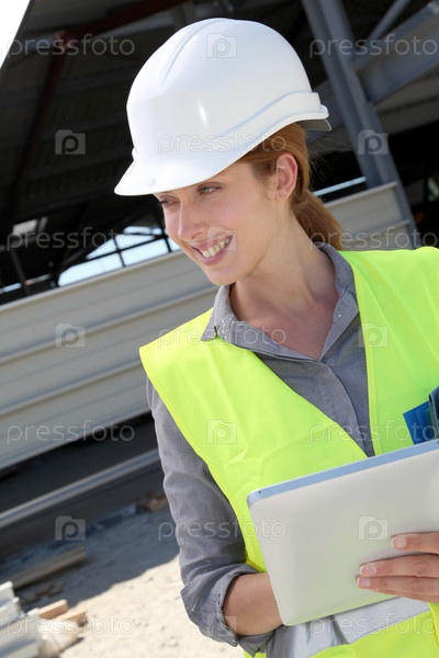 Инженер, проверка план строительства на сенсорной панели