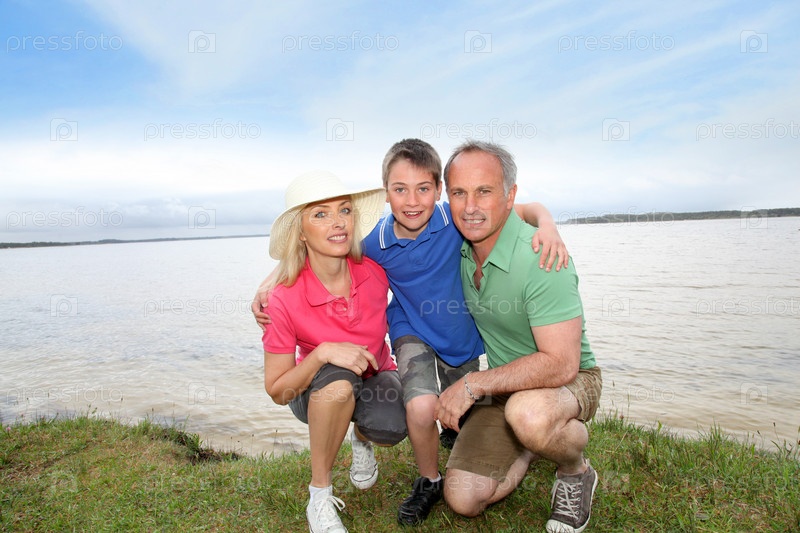 Портрет счастливой семьи, стоя на коленях на берегу озера