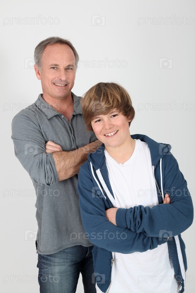 Отец и сын, стоя на белом фоне