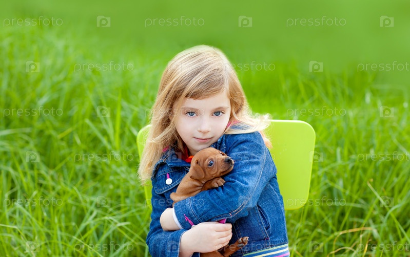 Девушка блондинка парень с щенка собаку сидеть в открытый зеленая трава