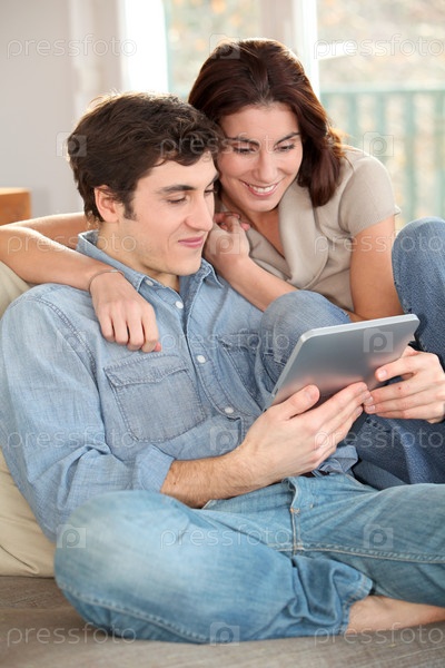 Молодая пара, с использованием электронных Планшетные дома