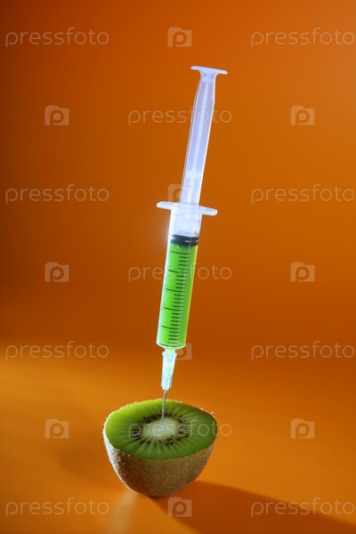 Инъекции шприцом зеленый киви на оранжевом фоне