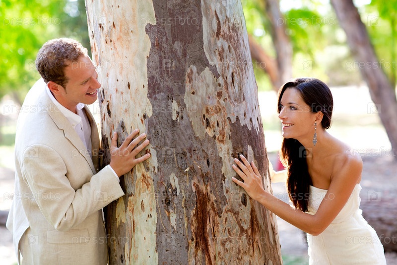 Пара счастлива в любви, играя в парке открытый ствол дерева