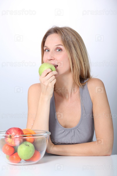 Крупным планом красивая женщина, держащая зеленое яблоко