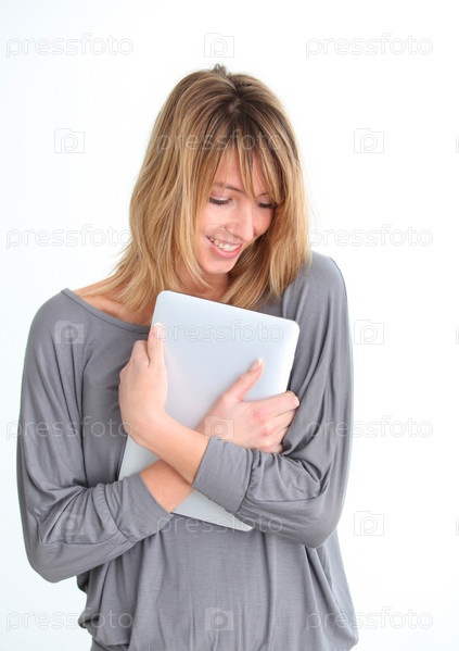 Блондинка женщина с электронный планшет на белом фоне
