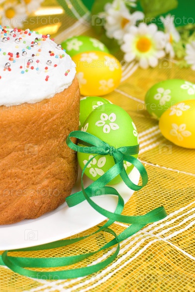 Пасхальные яйца и торт на ярком фоне
